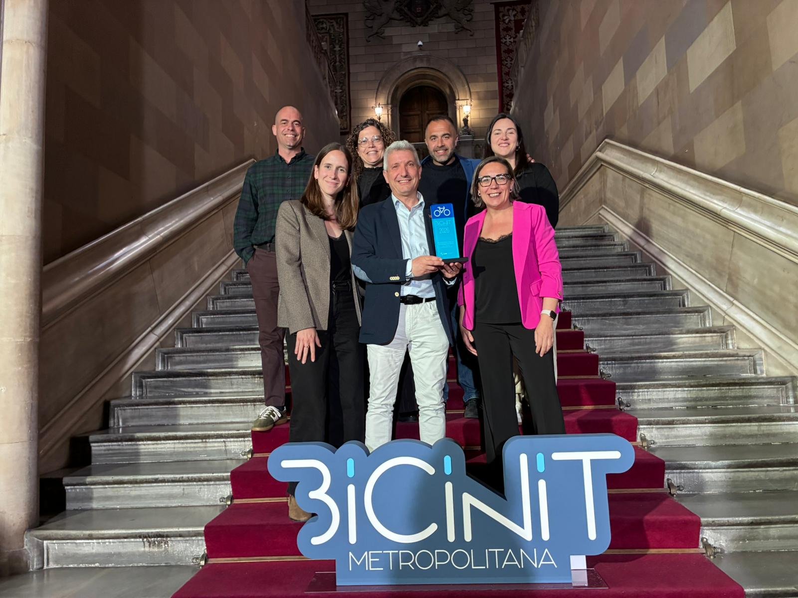El premio fue recibido este 8 de abril durante la primera gala de la Bicinit Metropolitana, organizada por AMB, que tuvo lugar en la Universidad de Barcelona.En la foto, el alcalde, Eduard Sanz, junto a la primera teniente de Alcaldía, Montse Zamora, la concejala de Movilidad Urbana y Sostenible, Claudia Acebrón, y personal técnico municipal.